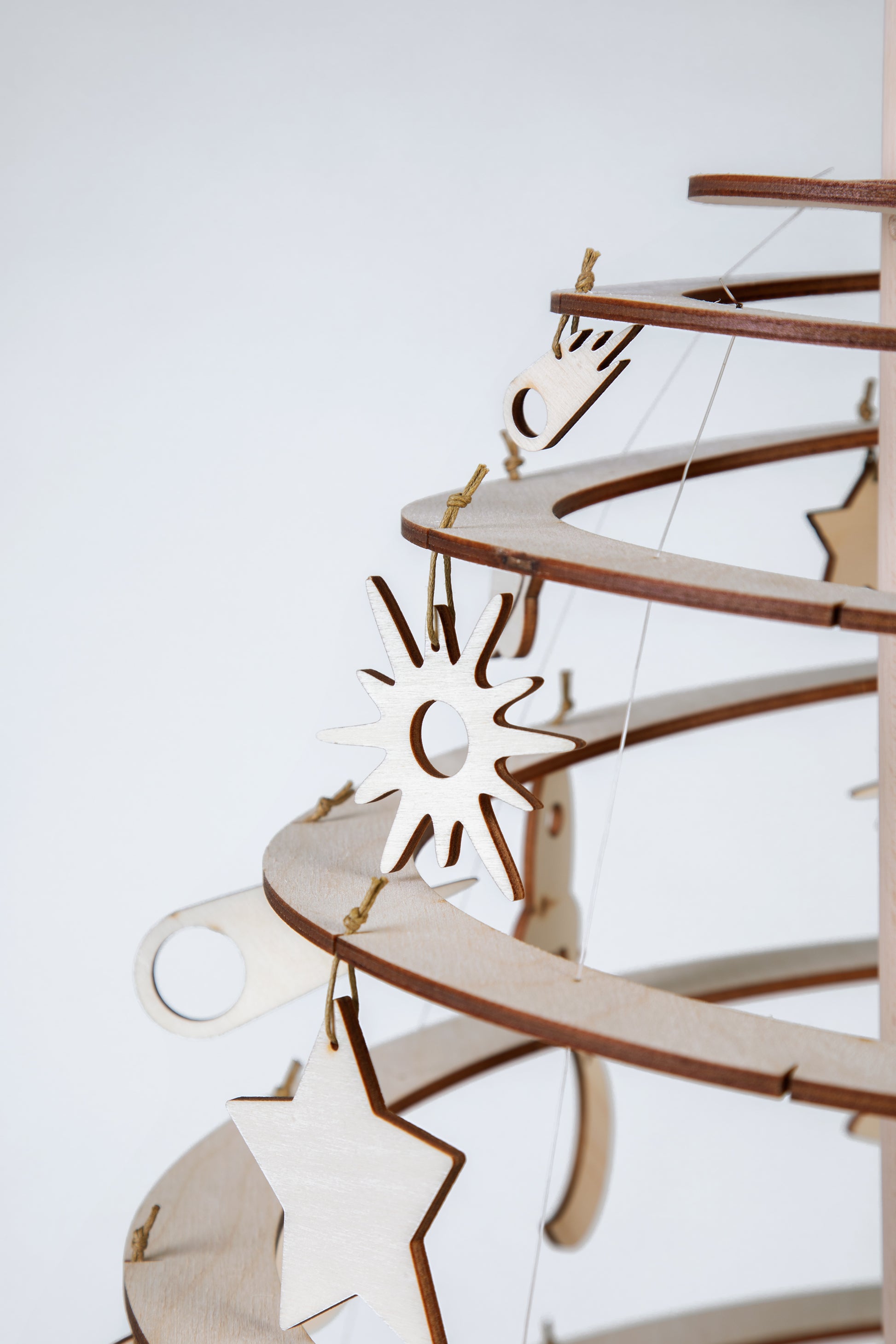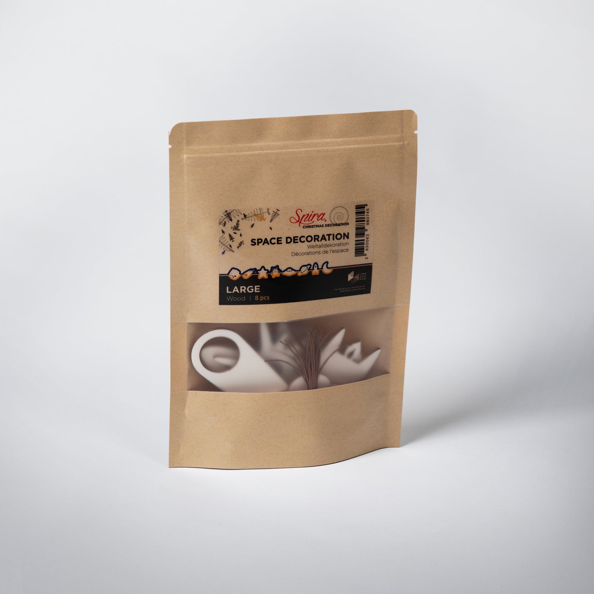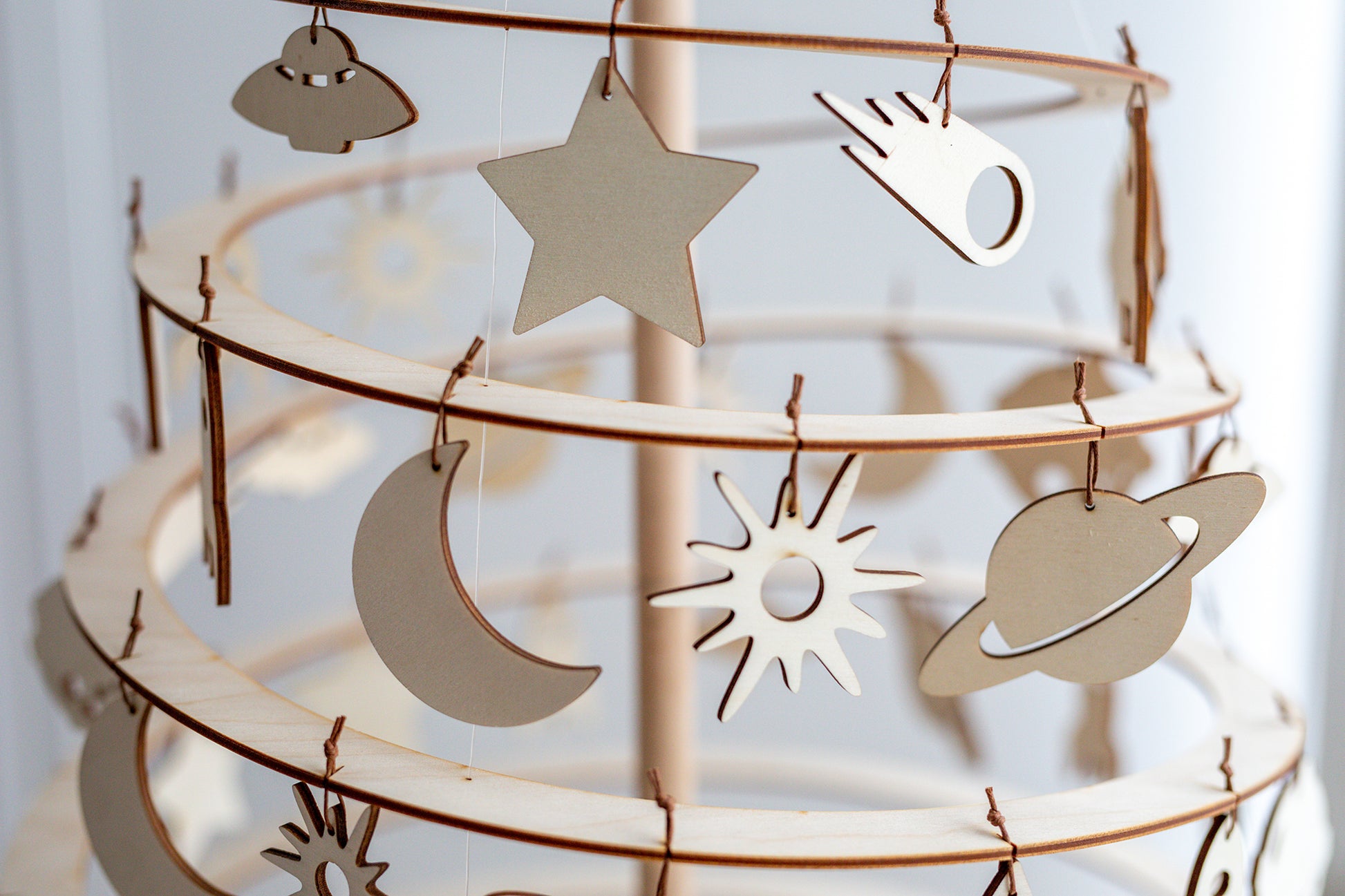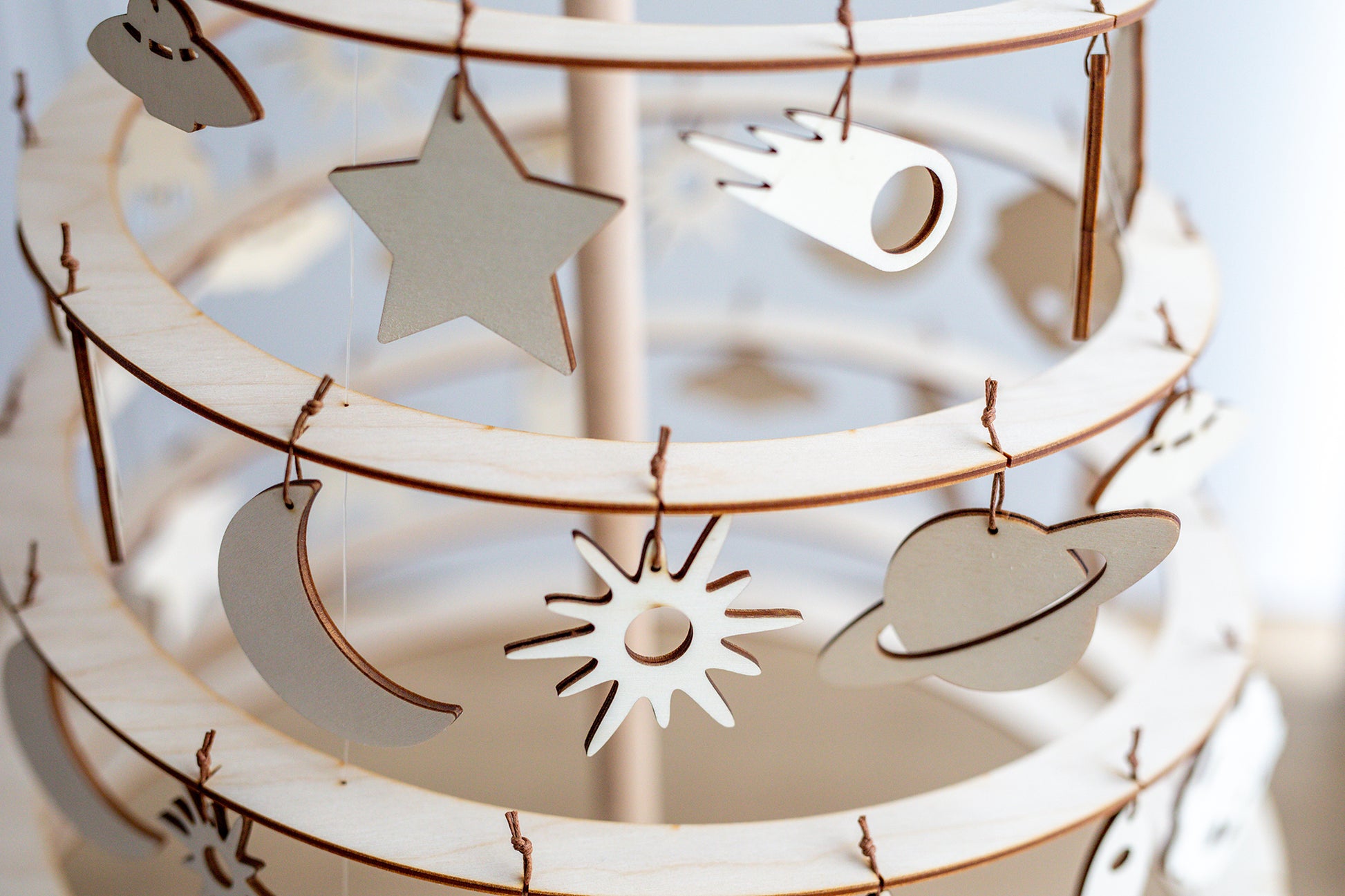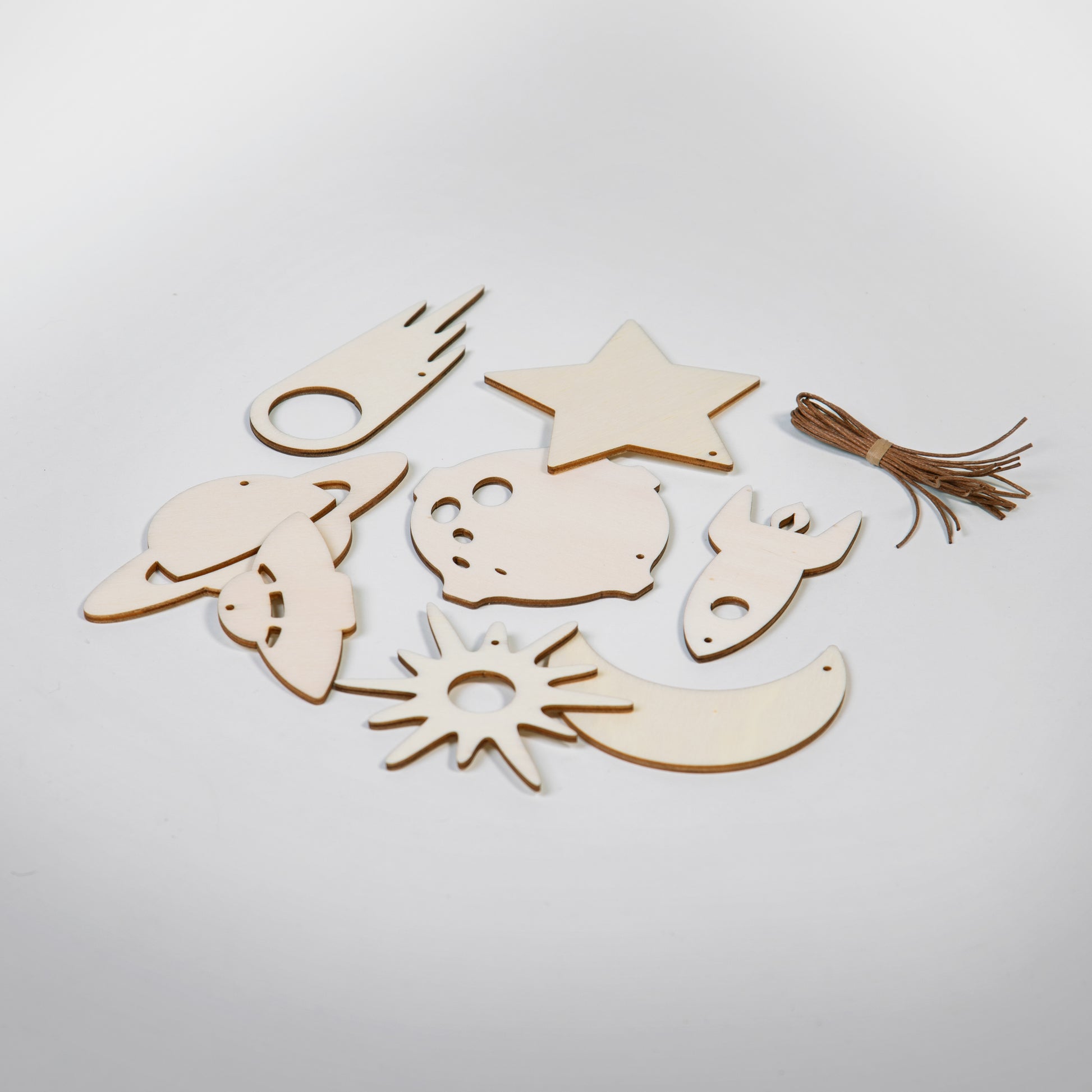 Et sæt træpynt i forskellige rumtemaformer er et fremragende valg til moderne og klassisk interiør. Det tidløse design og træets varme sikrer den perfekte juledekoration til ethvert hjem.