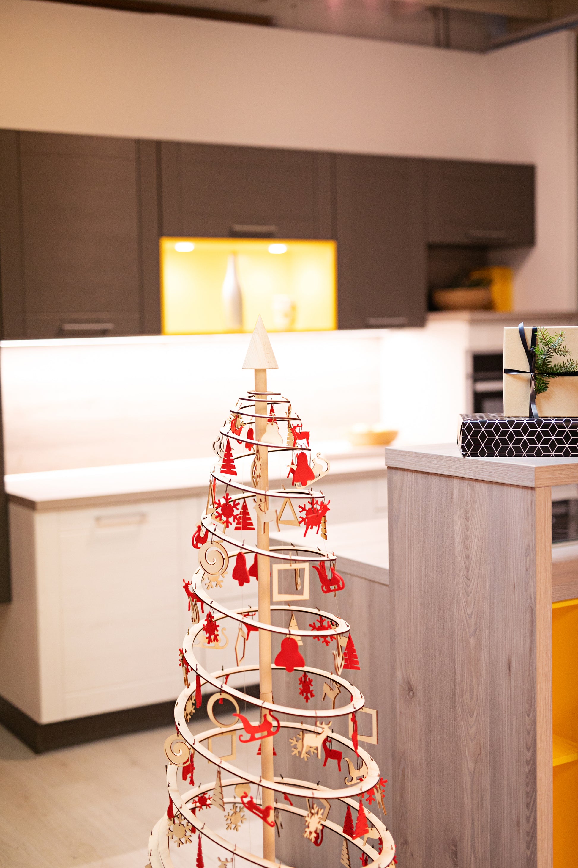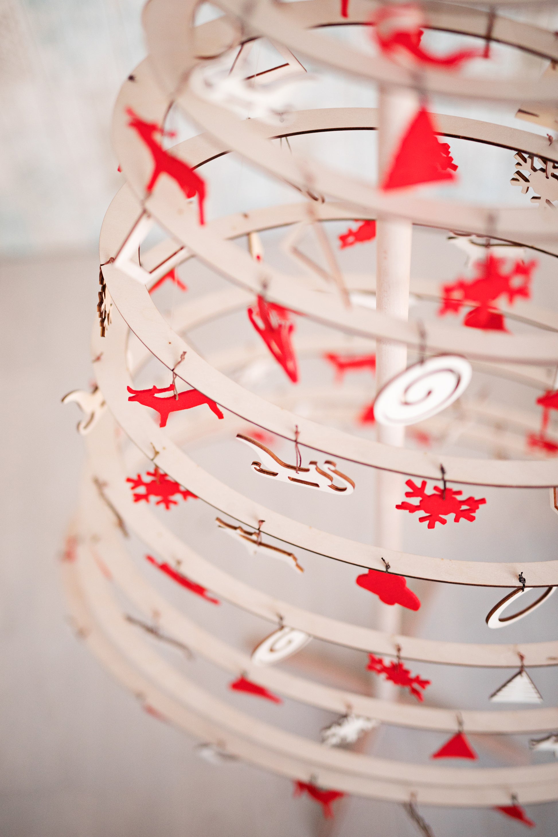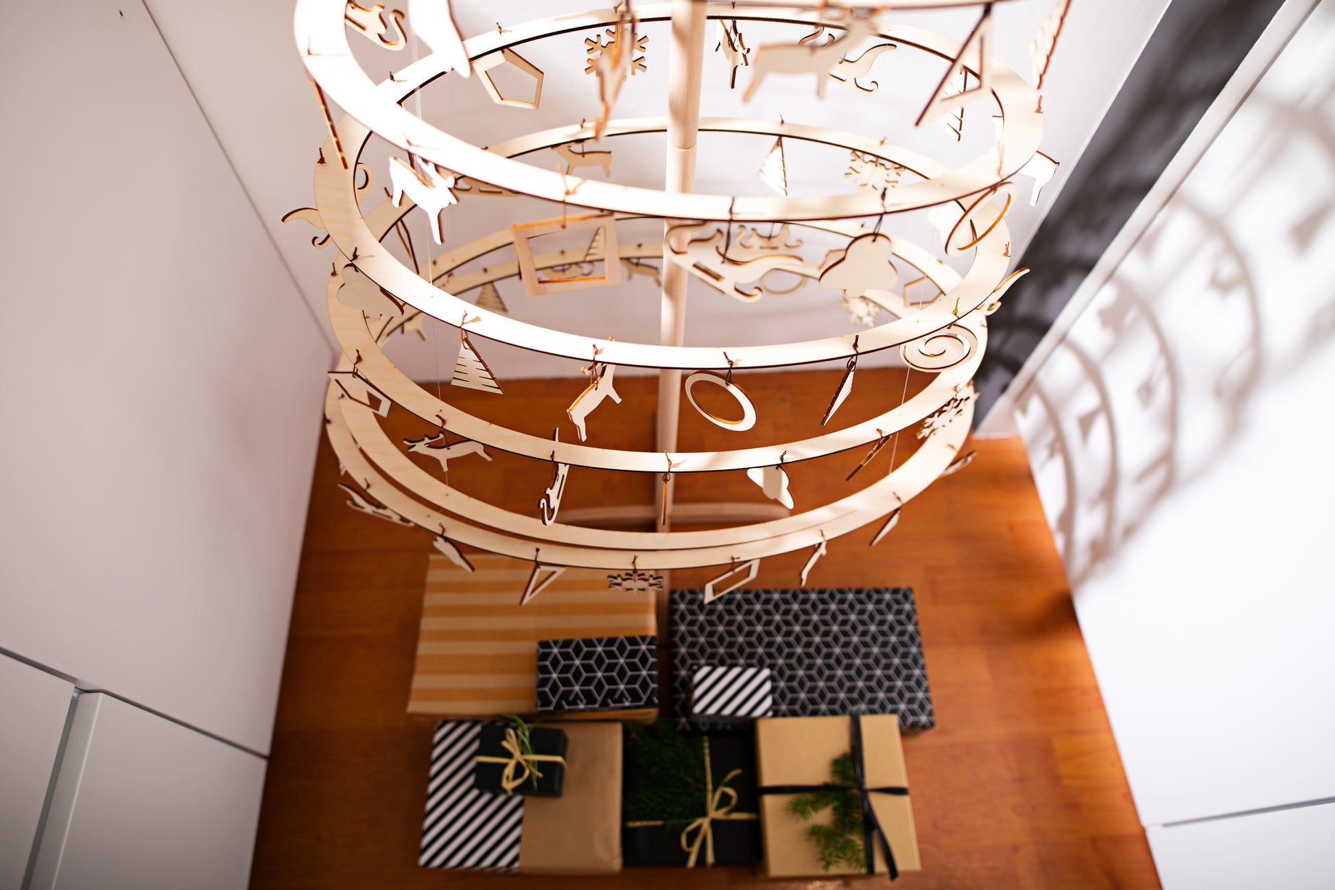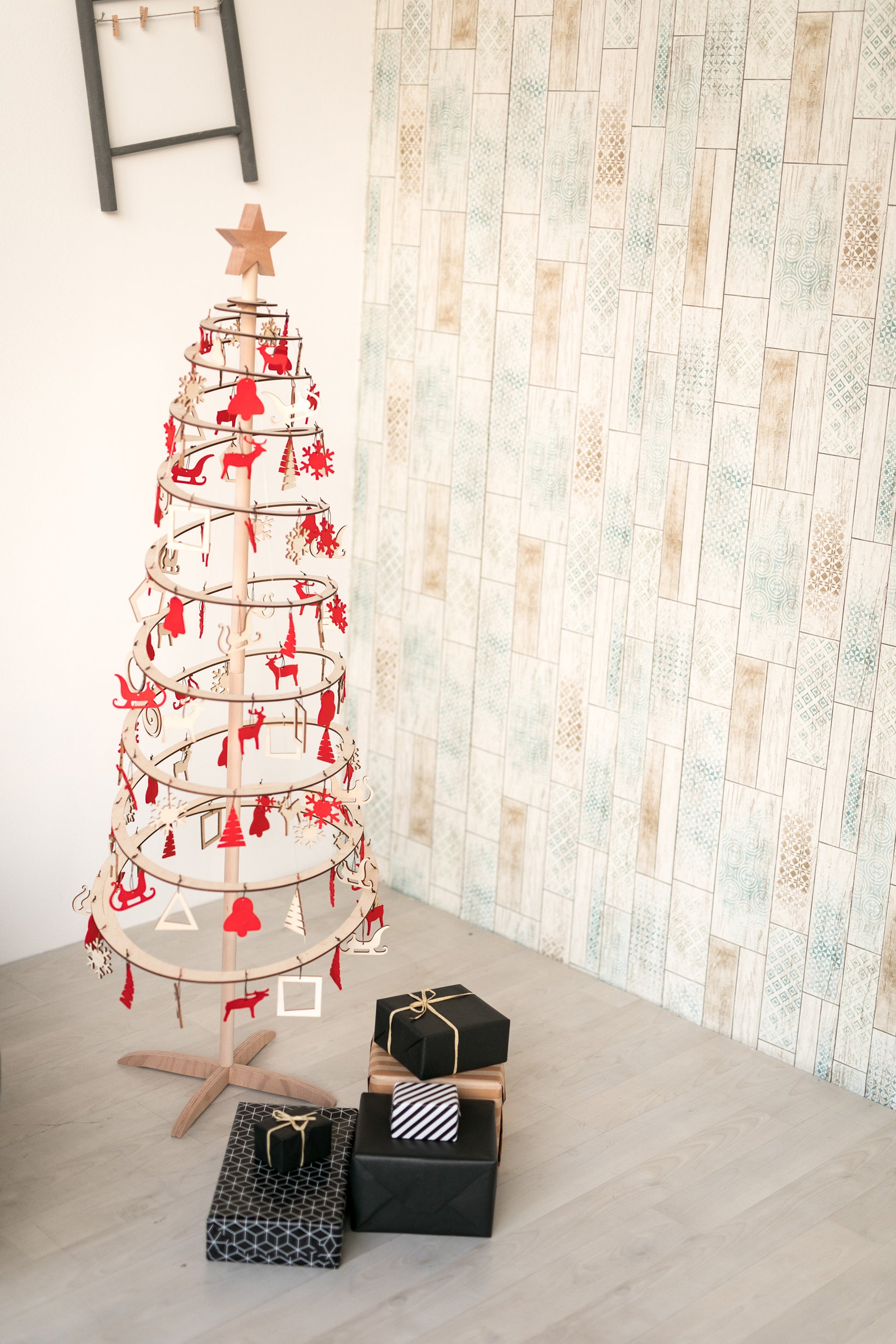 Juletræet foran dig er lavet af laserskåret krydsfiner og en træfod. Det kan hurtigt samles og skilles ad. Det giver også nem opbevaring i en 5 cm høj kasse.