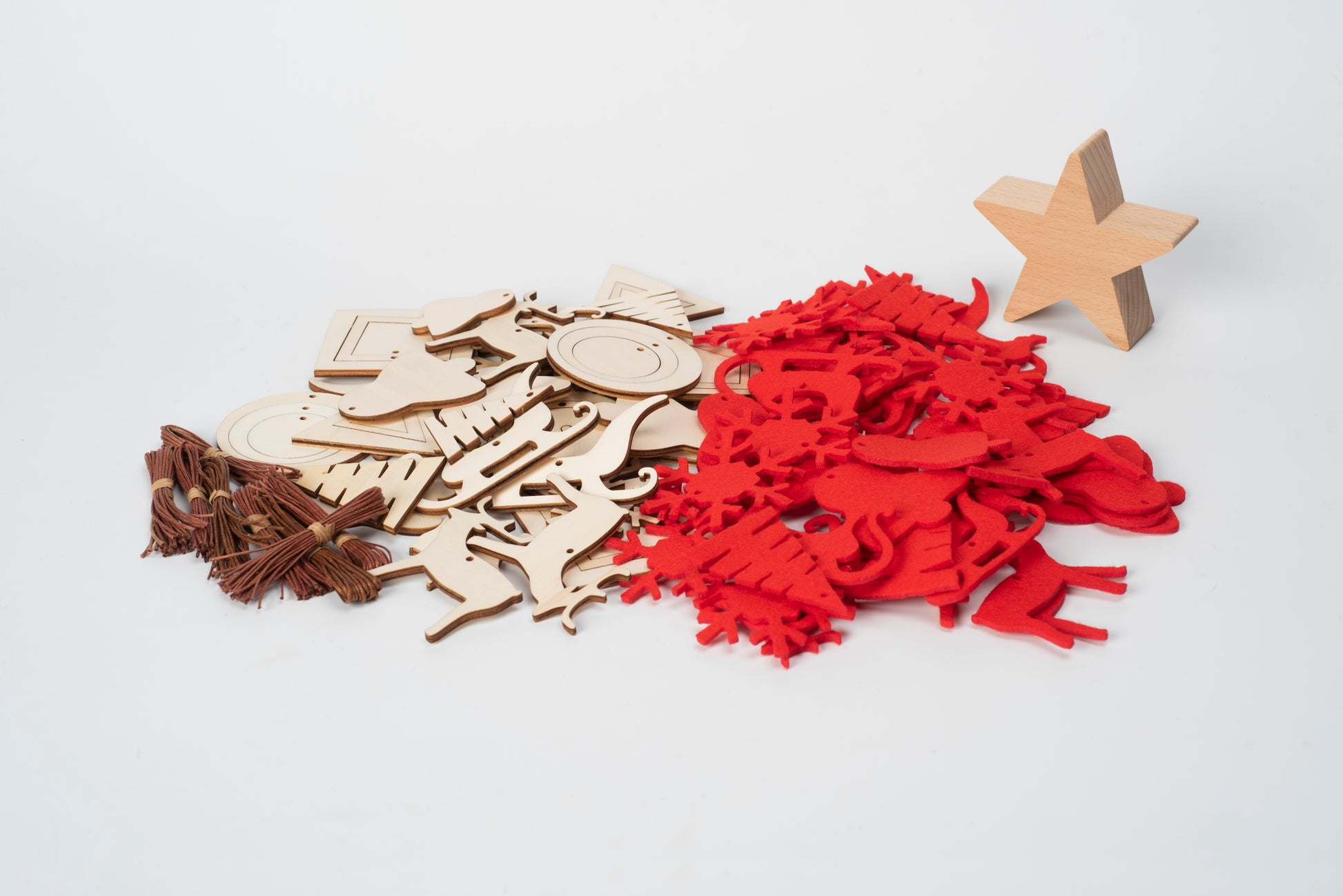 Sættet indeholder en træstjernetopper af træ og et passende antal ornamenter lavet af rød filt og træ. Ophængssnore medfølger.